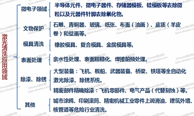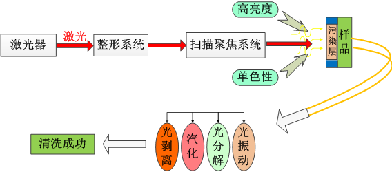 今的制造業發展迅猛,各種機械、電子產品的應用規模均大為增長。但這些設備在裝配之前以及運行一段時間之后,都需要進行一些維護,其中就包括對部分材料或部件進行清洗。傳統的清洗工藝如機械摩擦清洗、化學腐蝕清洗、強力沖擊清洗、高頻超聲清洗等,非常耗時,無法實現自動化,而且通常對環境造成有害影響。同時,也沒有測量清潔效果的可靠方法。與之相比,激光清洗具有無污染、無消耗品、成本低、效率高、無接觸、無應力、無損傷、可控性好、可選區精密清洗、可清洗難以到達的危險的區域等優點,被認為是未來最可靠、最有效的解決清洗問題的辦法。